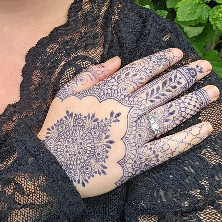 Op het moment dat de henna is aangebracht, fixeer ik het met een mengsel van citroensap en suiker. Hierdoor blijft het beter op de huid zitten zodra het is opgedroogd. Ik adviseer om de henna minstens 2 uur te laten zitten, en voor bruidjes zelfs minimaal 4 uur. Je kunt er ook mee slapen. In dat geval kun je het het beste afdekken met medische tape, watjes of huishoudfolie, zodat het goed blijft zitten.